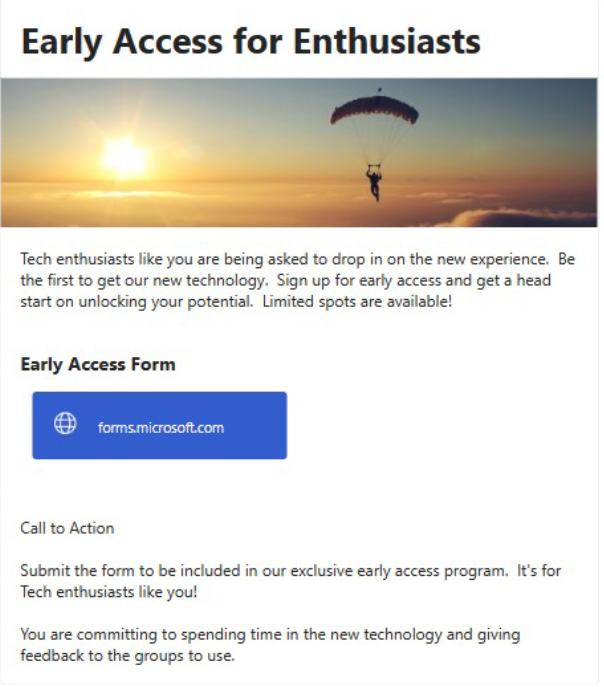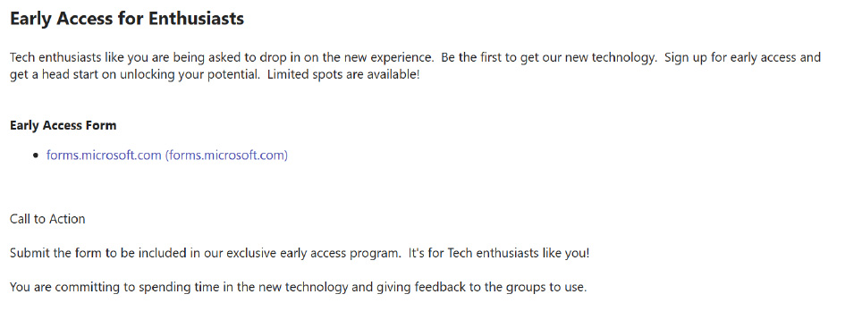Campagna di invito al beta testing: Invita un gruppo selezionato di clienti fedeli o appassionati a diventare beta tester per la nuova tecnologia. Crea una campagna attorno a questa opportunità esclusiva, dimostrando che apprezzi il loro contributo nel dare forma alla forma finale della tecnologia.